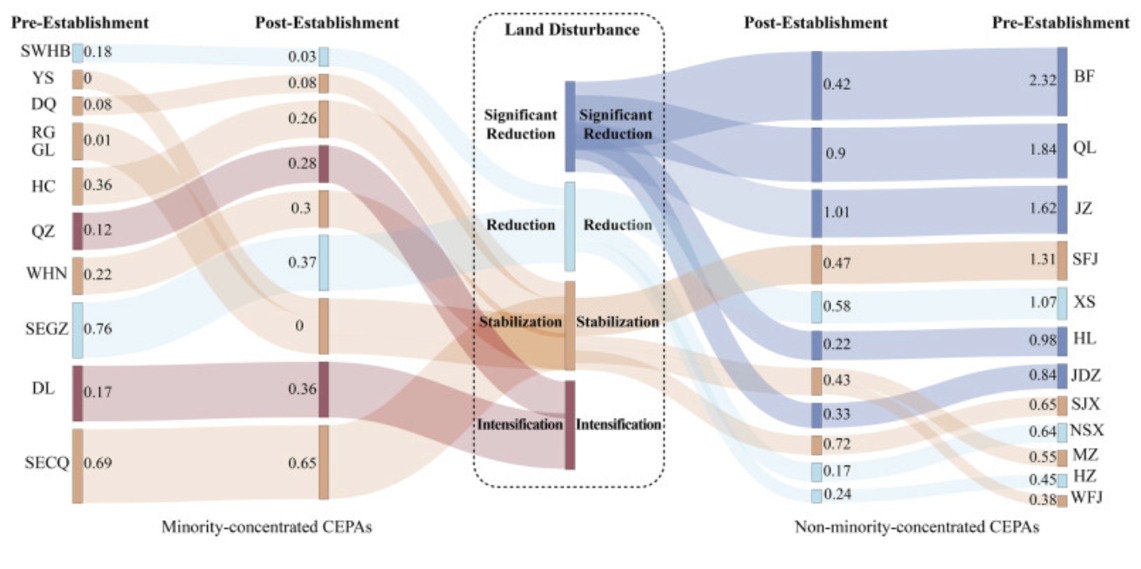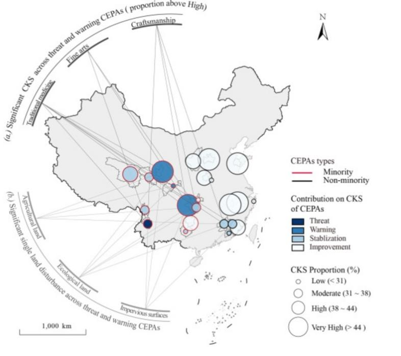 研究以“土地利用扰动”与“文化关键物种”为切入点,构建了一个多步骤评估框架,系统评估中国国家级文化生态保护区在保护原生态文化方面的有效性。研究指出,高度依赖环境资源的传统医药类文化遗产在土地格局变迁中显得尤为脆弱。该成果为解决全球保护区扩张背景下生态保护与文化多样性保护的协同问题提供了量化依据,对于落实“2030年生物多样性框架”中关于原生态社区权利与土地管理的承诺具有重要科学价值。