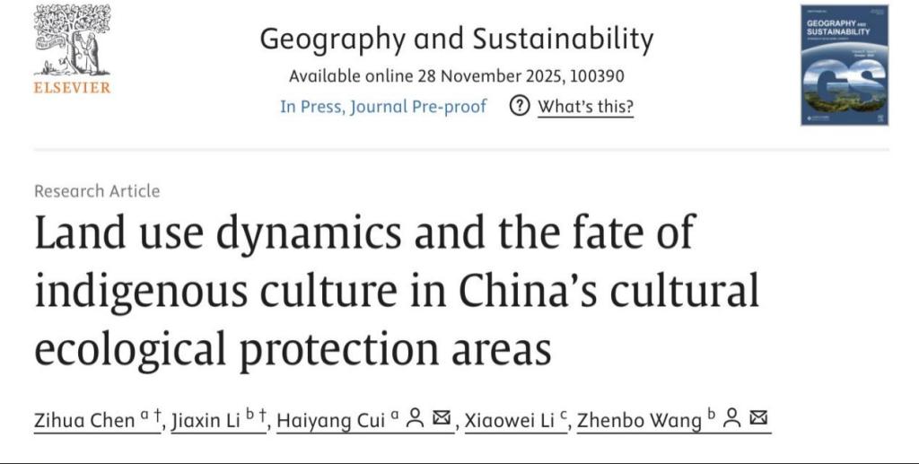 地理科学与资源研究所王振波研究员为共同通讯作者,贵州民族大学为第一单位,在环境科学领域权威期刊《Geography and Sustainability》上发表题为《土地利用变化与中国文化生态保护区原生态文化保护》(Land use dynamics and the fate of indigenous culture in China's cultural ecological protection areas)高水平学术研究论文。该研究标志着团队在人地关系与文化遗产保护交叉研究领域取得了持续性、系统性的创新成果。