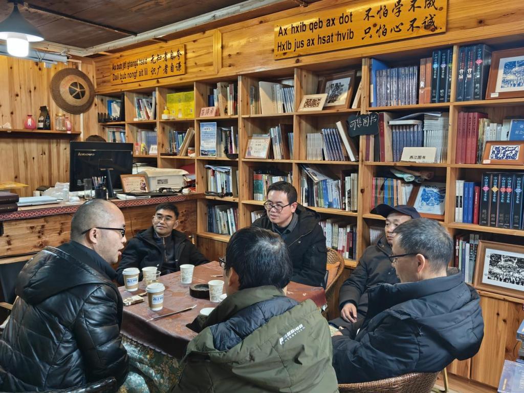 、地方党委政府、景区公司的大力支持下,该基地于2016年创办,长期致力于民族文化的挖掘、研究、传承与产学研一体化发展,同时开展民族文化旅游研究与人才培训工作。团队先后参观了基地内的西江书局与西江讲堂。在西江书局,调研人员浏览了基地多年来收集、整理及出版的丰富地方文献、学术著作与文化读物,对其在文献保存与知识传播方面所做的扎实工作表示赞赏。在西江讲堂,基地学生陆群艳向调研组详细汇报了基地自成立以来的发展历程、主要开展的田野调查项目、文化交流活动以及服务地方社会的具体实践,展现了其连接高校学术与地方田野的桥梁作用。