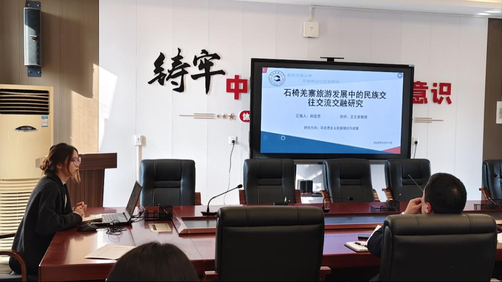 本次会议共有两项议程,第一项由马克思主义民族理论与政策方向2024级硕士研究生黄世成、阳亚芳、王莎莎3位代表进行开题汇报,主要汇报论文框架大纲及修改情况等;第二项议程为导师组根据同学们的汇报情况进行点评和指导。